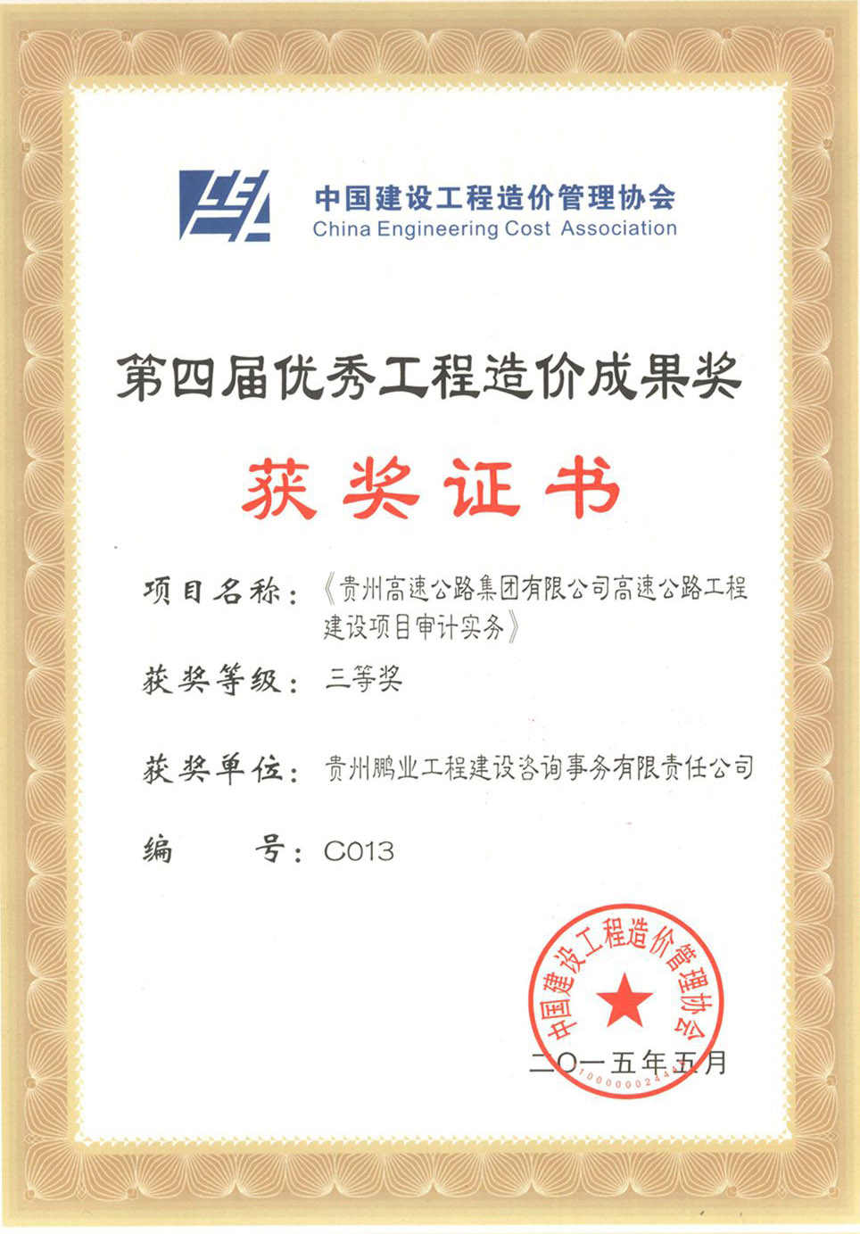 獲得中國工程造價協(xié)會頒發(fā)的第四屆工程造價優(yōu)秀成果三等獎